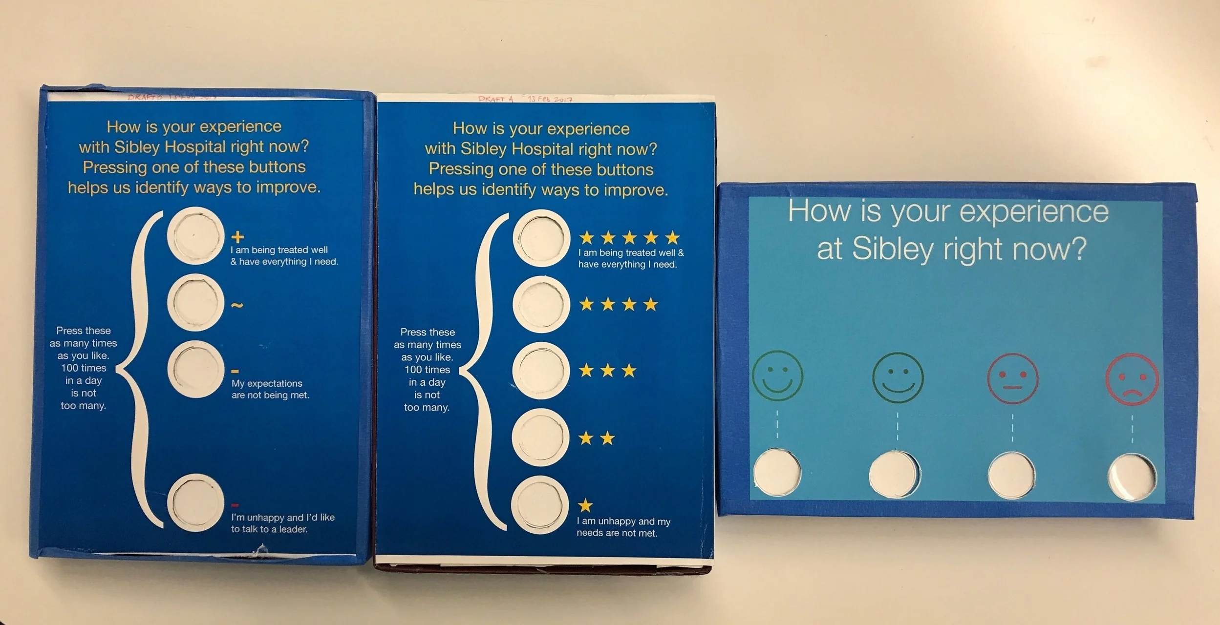 We've also been using the IoT buttons in a patient-facing prototype. For another project, we want to capture real-time feedback from people about their experiences. Matt and team mounted some of the buttons in a cardboard box, covered it with a slickly-designed label, and we had an instant, wireless feedback device. We were able to iterate on how we asked questions about patient experiences quickly and deploy the experience boxes into patient areas without any obstacles. And, since they are easily programmed, we can get the data in really convenient ways. When a button is pressed, not only is it logged into a Google Sheet, but a robot pops a notice into our team's Slack board telling us what the feedback is and from where in the hospital it originated.